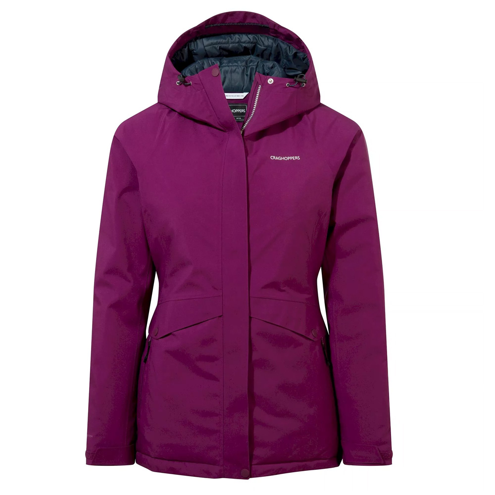 Diese wasserdichte Craghoppers Gore-Tex® Thermo-Jacke gehört zu den Besten ihrer Klasse und ist ein optimaler Begleiter für all jene, die sich von winterlichem Wetter nicht abschrecken lassen.Denn Ellis ist einfach beeindruckend.Ihr zweilagiges, dehnbares Gewebe setzt auf die wasserdichte GORE-TEX®-Technologie, um dir perfekten Schutz vor den Elementen zu bieten, während das Lux- und Taftfutter und die isolierende Hohlfaserwattierung für Wärme sorgen.Eine flexible, wunderschöne Kapuzenjacke, die ganz auf Leistung eingestellt ist.Für die Herstellung dieses Craghoppers Produkts wurden etwa 60 Flaschen recycelt.Craghoppers ist seit 2018 Partner des bluesign®-SystemsGore-Tex® 2 Lagen Membrane – wasserdicht – winddicht – atmungsaktivWassersäule außen: bis zu 28.000 mmAtmungsaktivität: > 15.000 g/m²/24h (MVTR Wert)ThermoAir+ Wattierung – synthetische Alternative zu NaturdaunenStretch Gewebe – für optimale BewegungsfreiheitProdukt enthält recycelte Materialien – aus benutzten PET Plastikflaschen zu Polyester, wodurch CO2 – Emissionen und Deponieabfälle reduziert werden.Sicherheitstasche mit ReißverschlussMobiltelefontascheLandkartentasche2 Seitentaschen mit Druckknopf  Reißverschluss mit innen liegender, schmaler Schutzleiste und schmaler, verschweißter SturmpatteFest vernähte KapuzeMaterial: 100 % PolyesterGewicht: Gr. 720 g bei Gr. EU 36/SGrößenauswahl: Das Model ist 1,72 m groß, 60 kg schwer und trägt die Größe EU 36/SFarben können auf Ihrem Bildschirm leicht vom realen Produkt abweichen,bedingt durch Lichtverhältnisse und individuelle Bildschirmeinstellungen.Dies ist ein Markenartikel von:Craghoppers GmbHBrooktorkai 11DE – 20457 Hamburgkundenservice@craghoppers.com
