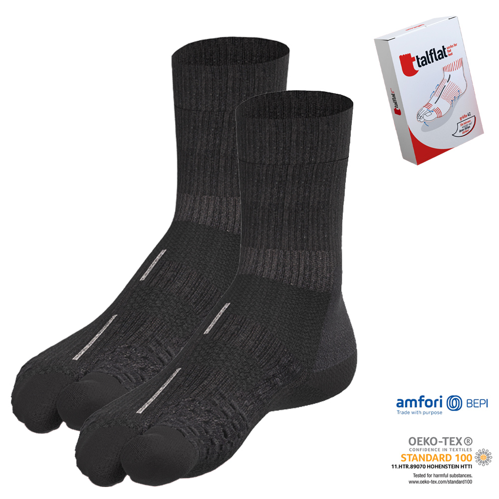 Talflat ist ein innovatives Produkt, das speziell für Personen entwickelt wurde, die unter Plattfüßen, Fußschmerzen, Hallux Valgus und Knieschmerzen leiden und tagsüber viel stehen oder gehen müssen. Es lindert effektiv Schmerzen und verhilft dem Fuß zu seiner natürlichen Wölbung zurückzufinden. Dank der fortschrittlichen Stricktechnologie von Talflat wird die richtige Haltung des Fußes wiederhergestellt.   Material: 67% HealTECH, 21% Baumwolle, 12% Elasthan Die Socke trennt den großen Zeh von den anderen Zehen ab und stabilisiert gleichzeitig die Ferse. Durch regelmäßiges Tragen von Talflat können Sie schnell positive Ergebnisse erzielen und Ihre Bewegungsfreiheit beim Gehen wieder vollständig genießen. Der Vorteil von Talflat liegt darin, dass es sich problemlos in Ihren Alltag integrieren lässt – im Gegensatz zu herkömmlichen medizinischen Produkten. Es bietet nicht nur entspannende Lösungen bei Plattfußproblemen, sondern ermöglicht Ihnen auch eine leichtere Bewältigung Ihres Alltagslebens. Egal ob im Beruf oder beim Sport: Mit Talflat sind Sie immer bestens ausgerüstet und verpassen keine Gelegenheit mehr aktiv am Leben teilzunehmen – selbst wenn dies aufgrund Ihrer Plattfußprobleme früher schwierig war. Das Anziehen der Talflat-Socke gestaltet sich einfach: Dehnen Sie zunächst den Bereich um Ihre Zehen gut mit Ihren Händen aus und ziehen Sie dann die Socke über Ihren Fuß. Achten Sie dabei darauf, dass sie richtig positioniert ist gemäß den Bezugslinien. Sehen Sie sich das Video an und lassen auch Sie sich davon überzeugen wie unkompliziert, schnell und effektiv Talflat ist! Physiotherapeutin – Testerin: „Mir  begegnen viele verzweifelte Patienten, die mit ihren Einlagen in den Schuhen noch mehr Schmerzen haben. Diese Socken sind genau richtig, für Probleme mit Platt- oder Senkfuß oder auch mit einem Hallux Valgus (wenn die große Zehe sich nach innen biegt). Der Fuß und das Großzehengrundgelenk werden sanft entlastet und dadurch dass nichts starr in eine Form gezwungen wird, entsteht folgender positiver Effekt: die Muskulatur kann lernen, wieder richtig zu stützen, die Gelenke können sich trotzdem bewegen – das heißt die Knorpel werden trotzdem ernährt.Durch die leichte Kompression wird zusätzlich der Lymphfluss aktiviert.!“