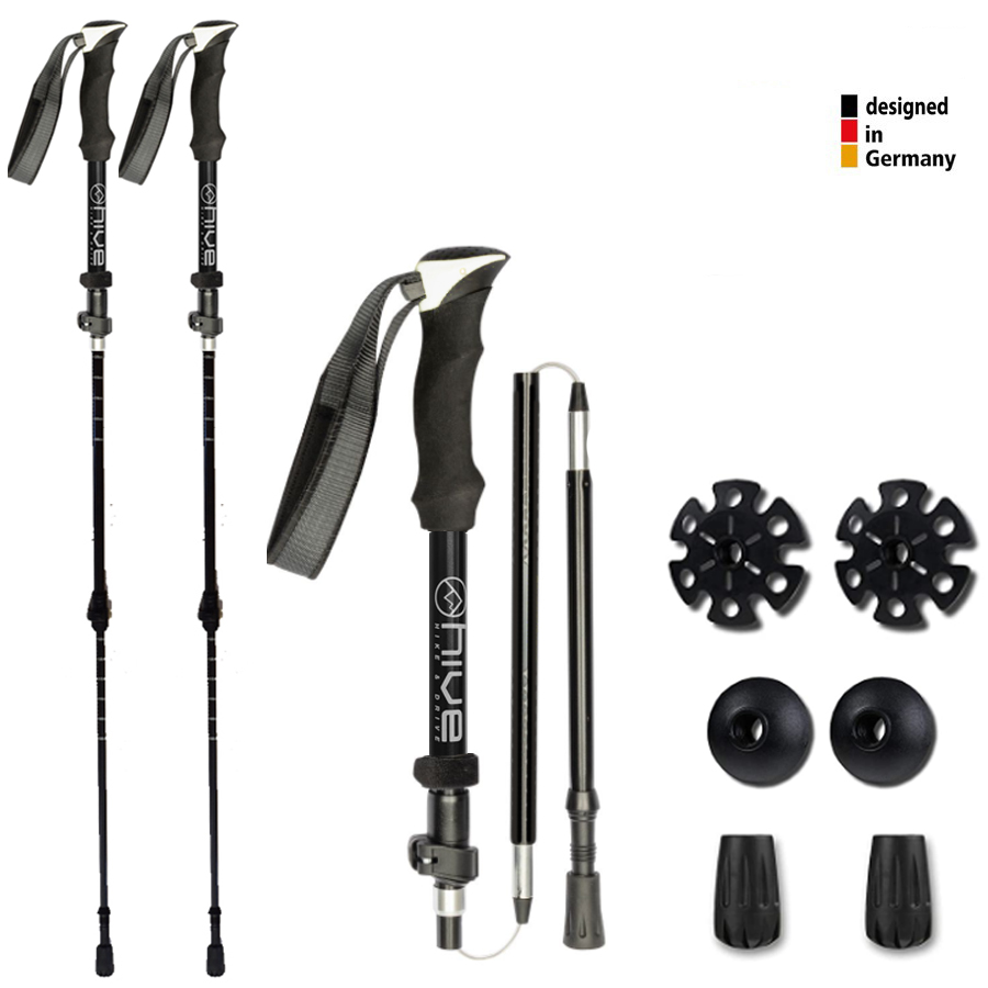 Kleines Packmaß und  dennoch optimale Sicherheit beim Wandern! Lieferumfang:2 Stück faltbare Stöcke, 2 x Sommerteller, 2 x Winterteller, 2 x Spitzenschutz, 1 x KlettbandEgal ob für normale Spaziergänge, zum Trailrunning, Schneeschuhlaufen, für große und kleine Wander- oder Trekkingtouren.  Schnell und einfach auf- und abgebaut sind die Faltstock Modelle von Hive.  Die perfekte Stabilität garantiert das kevlarverstärkte, filigrane High-Performance Spannseil mit seiner robusten PE Ummantelung, welche den Fasern lebenslangen Schutz bietet.Eine permanente, optimale Spannung des Seils, wird durch die Spannung des oberen Rohrs bis zum Druckknopf gewährleistet, die dann automatisch die Längenkompensation vornimmt. Die ergonomische Handschlaufe in Kombination mit dem Schaumgriff  bietet ein zusätzliches Plus an Sicherheit und sorgt dafür, dass man die Stöcke bei jeder Witterung  immer perfekt im Griff hat.- Gewicht: federleichte 250 Gr. pro Stock- Konstruktion: 3-Segmente Teleskopstöcke – faltbar!- Einsatzbereich: Tagestouren, Wandern, Trekkingtouren Trailrunning,  Schneeschuhlaufen,- Material: Alu 7075 (Duralumin)- Verstellbereich: 115-135 cm Stocklänge- Länge gefaltet mit kleinen Packmaß von nur ca. 36 cm- Klemmsystem: einfach justierbare Außenklemmung und faltbare Elemente!- Handschlaufe: ergonomischer  Security Strap- Teller: Sommerteller, Winterteller- Spitze: Wolfram/Karbid  Flexspitze, sowie abnehmbarer Asphaltpad Spitzenschutz-  ergonomischer Schaumstoff GriffOptimale Stocklänge ermitteln:  Bei einer Körpergröße von z.B. 160 cm ist die exakte Länge: 109 cmEs empfiehlt sich eine Stocklänge von: 110  cmFormel: Körpergröße x 0,68 = Stocklänge in cm.  Zusammenbauen der Stöcke:Zuerst den untersten Segment in das mittlere Segment einstecken.Dann das mittlere Segment in das obere Segment einstecken.An dem oberem Segment, unterhalb des Silberrings ziehen, bis ein Klickgeräusch hörbar wird, weil das Segment mit einem Schnapp Druckknopf einrastet.An dem oberem Segment oberhalb des Silberringes kann nun die Höhe verstellt werden.Dazu das Klemm-Mechanismus öffnen und nach oben schieben.Beim Stoppzeichen an der Skala ist die Maximale Länge erreicht.Zum Falten der Stöcke in umgekehrter Reihenfolge vorgehen.Dabei an dem oberstem Segment den Druckknopf eindrücken.  hive – designed in Germany