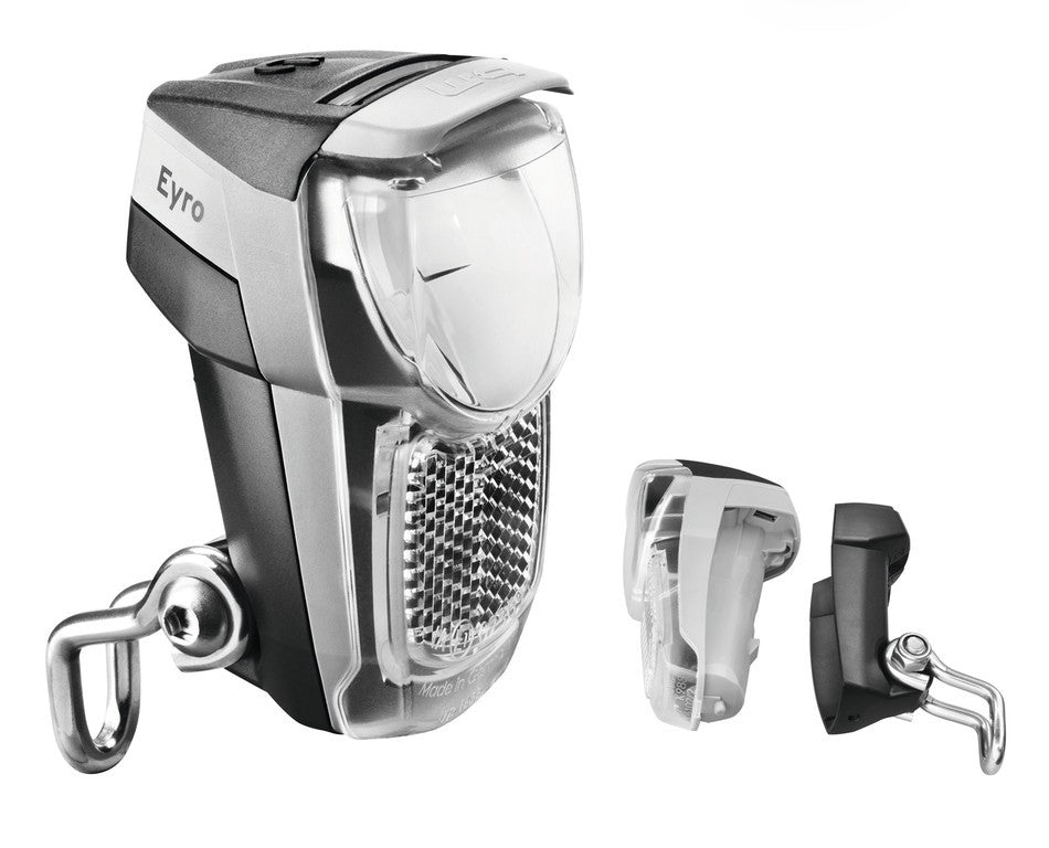 B+M LED-Akkuscheinwerfer Lumotec IQ Eyro • 30 Lux• zur Montage an der Vorderradgabel• Nahfeldausleuchtung• HighPower 30 Lux > 5h• LowPower 10 Lux ~ 15h• mit einem Handgriff vom Halter abnehmbar, alternativ mit nur einem Klick diebstahlgeschützt am Rad• eingebauter Lithium-Akku, per USB aufladbar (Kabel beiliegend)• Indikations-LED• integrierter Front-Rückstrahler• StVZO-zugelassen für alle Räder