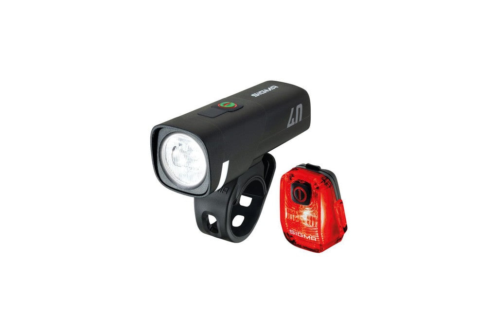 SIGMA LED-Akku-Beleuchtungsset Aura 40 USB / Hiro 10 Aura 40• Beleuchtungsstärke: 40 Lux (15 Lux im Eco-Modus)• Leuchtweite: 50 m• Leuchtdauer: 9 h im Standard-Modus,29 h im Eco-Modus• Ladezeit 3 h• Einschaltschutz (Doppelklick für ON)• Spritzwassergeschützt nach IP44• 360° verstellbare Halterung• werkzeugfreie Montage• integrierte USB-C Ladefunktion• dreistufiger Akku- und Ladeindikator• Gewicht: 113 g (inkl. Halterung)• seitliche Sichtbarkeit• Osram LEDHiro 10• 500 m Sichtweite• Brenndauer: 13 h • Ladezeit: 3 h• werkzeugfreie Montage mit flexibler Silikonhalterung• integrierte USB-C Ladefunktion• seitliche Sichtbarkeit 240°• zweistufiger Akku-/Ladeindikator• spritzwassergeschützt nach IP44• Gewicht: 31 g • StVZO zugelassen