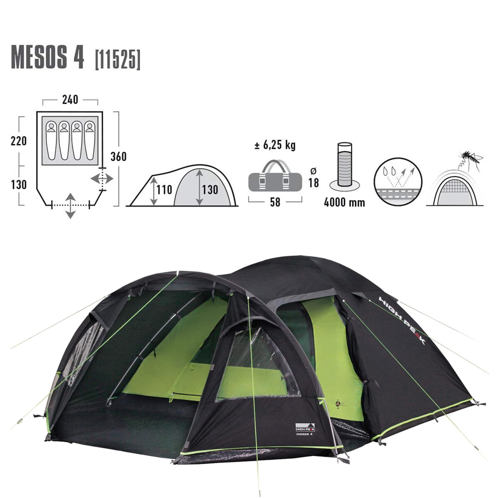 High Peak – die Camping MarkeFür jeden das RichtigeCamping lieben und leben. So wie es gefällt. Unsere Leidenschaft. High Peak ist und bleibt die Marke für Camper. Mit größter Leidenschaft arbeiten wir von jeher daran, besser als jeder andere zu verstehen, was Camper brauchen und was sie begeistert. 30 Jahre Erfahrung. Von Anfang an, seit der Gründung von High Peak im Jahre 1984, war es uns wichtig, all die Erfahrungen und Erlebnisse aus den vielen Reisen ständig in die Entwicklung von Camping- Produkten einfließen zu lassen. Die Veränderungen in den Beschaffungsmärkten erlebten und gestalteten wir mit. So wurden wir zum Wegbegleiter für alle, die Camping leben! Hochwertiges Polyester PU beschichtet, hohe Wassersäule wasserdicht durch Nahtversiegelung. Atmungsaktives Polyestergewebe Wasserdichter, unverrottbarer Polyethylenen Zeltboden Extrem belastbarer, leichtgängiger Marken ReißverschlussWettergeschützter Eingang hält den Innenraum trocken Vorbau mit Stauraum für Campingausrüstung. Vorbau mit Faulstreifen hält Schmutz und Feuchtigkeit ab. Klarsichtfolien Fenster bringen Licht ins Innere. Gardinen schützen vor neugierigen Blicke. Seiteneingang mit Reißverschluss Einfassband nahtversiegelt für Wasserdichtigkeit auch an der Seitentür. Klarsichtfolien Fenster bringen Licht ins Innere. Gardinen schützen vor neugierigen Blicke. 3 Dauerventilationen mit Abstandhalter für ein besseres Zeltklima und optimale Belüftung. Gut sichtbarer neongrüner Bodenstreifen in der Dämmerung. Gestänge Markierungen erleichtert den AufbauVario Vent Control Eingang lässt sich das Belüftungsfenster variabel je nach Klima bedienen. Optimale Belüftung und Mückenschutz. Der Wannenboden verhindert Eindringen von Nässe und Schmutz. Innentaschen für diverser Utensilien Lampenhalter zum Aufhängen eine Camping- oder TaschenlampeKompressionspacksack in Übergröße vereinfacht das Einpacken Extra starke 5 mm Erdnägel. Hochwertige, gut sichtbare neongrüne Abspannleinen. Angenähter Zeltboden an der Innenzelfront für einen sauberen VorraumHochwertiges Gestänge aus Fiberglas 8,5 mm mit praktischem Gummizug verbunden Maße & GewichtLänge      360 cmBreite      250 cmHöhe      135 cmGewicht      6,25 kgLänge Packmaß      58 cmBreite Packmaß      18 cmHöhe Packmaß      18 cmLänge Innenraum      240 cmBreite Innenraum      220 cmHöhe Innenraum      130 cmDurchmesser Stangen      8,5 mm Vario Vent Control SystemFrischluft im Innenzelt Das ausgetüftelte Vario-Vent-Control-System lässt sich bequem von innen mittels Reißverschlüssen variabel bedienen. Ein großes Gazefenster bringt Frischluft und kann, wenn es ungemütlich wird, einfach mit der Abdeckklappe verschlossen werden. Die Abdeckklappe lässt man einfach in eine Tasche fallen. Aufrollen passé. Bei geschlossener Abdeckklappe sind zusätzlich 2 Dauerventilationen für die Luftzirkulation vorhanden. Qualität,die nicht still stehtUnser Ziel ist es, die Ausstattung ständig zu optimieren. Bei allen High Peak Zelten sind die Nähte mit einem hochwertigen Nahtband thermisch wasserdicht versiegelt. Hochwertige, stabile Heringe gehören zur Ausstattung. Wasserdicht und NahtversiegeltUnser Materialanspruch ist die Zelt Norm DIN EN ISO 5912 und besser. Alle Zelte sind nahtversiegelt und mit einer hochwertigen PU-Beschichtung von 4000 mm ausgerüstet. Das Packsack-KonzeptAktivzelte werden in Kompressionspacksäcken zur Packmaß-Minimierung geliefert. Campingzelte in einer praktischen Tragetasche mit extra robustem Reißverschluss. Premium-Campingzelte in Blasebalg-Kompressionspacksäcken und Familienzelte in robusten Oxford-XL-Packsäcken mit „Roll Down“-Funktion. Die „Roll Down“-Funktion mit Schnellverschlüssen bringt den Zeltsack in die richtige Größe. Farbe & MaterialFarbe      dunkelgrau-grünMaterial Außenzelt      PolyesterBeschichtung Außenzelt      Polyurethan (PU)Material Innenzelt      PolyesterMaterial Boden      PolyethylenMaterial Gestänge      GlasfiberMaterial Heringe      StahlHerstellertechnologien      Vario Vent ControlTechnische DatenWassersäule Außenzelt      4000 mm Camping lieben und leben. So wie es gefälltUnser Materialanspruch ist die Zelt Norm DIN EN ISO 5912 und besser. Alle Zelte sind nahtversiegelt und mit einer hochwertigen PU-Beschichtung von mindestens 1500 bis zu 4000 mm ausgerüstet. Sie sind mit praxistauglichen Ventilationssystemen für Sicherheit und Komfort aus- gestattet. Einfacher Aufbau durch farbige Gestänge- Markierungen und Aufbauvideos. Klare Produktlinien für Camping in allen Variationen.