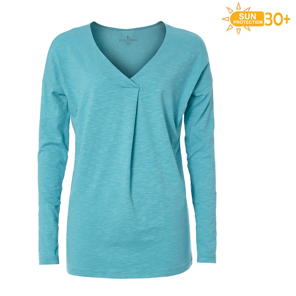 Farbe: türkis (Porcelain)  schwarz (jet  black), weiß (creme)    lila Ein elegantes Shirt aus mittelschwerem, dezentem Baumwoll-Slub-Garn, gemischt mit Polyester und Yaron für einen tollen Fall mit Stretch für Komfort.  Ein perfektes Teil für unterwegs, mit 30+ UPF-Schutz, um Ihre Haut zu schützen, während Sie die Sehenswürdigkeiten ansehen.  Der V-Ausschnitt mit plissierter Crossover-Vorderseite verleiht diesem Stück einige anmutige Details. Merkmale: Slub Jersey Strick V-Ausschnitt mit plissiertem Crossover vorne Gerader Saum UPF 30+ Schutz Langarm Standard-Passform weich Abgesetzte Schulternähte 52 % Baumwolle, 34 % Polyester, 10 % Viskose, 4 % Elasthan Info:    Die Darstellung der realen Farbe am Bildschirm ist sehr schwierig. Diese kann je nach Licht beim fotografieren, oder durch die Bildschirmeinstellung,  beim Kunden anders erscheinen. Beim Bild handelt es sich um eine Katalogabbildung. Verkauf solange der Vorrat reicht.