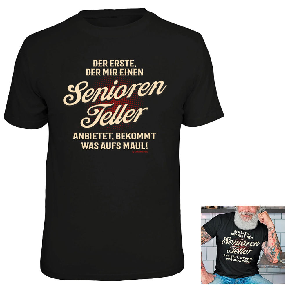 Im echten Siebverfahren bedrucktOptimaler Tragekomfort100% BaumwolleHervorragende WaschbeständigkeitDas perfekte T-Shirt für „schlagkräftige“ Jungbleibende Es heißt ja, mit dem Alter wird man gelassener – aber nur bis zu einem gewissen Grad. Beim Seniorenteller ist definitiv Schluss mit lustig! Trotzdem ist die „Drohung“ auf dem T-Shirt hoffentlich nicht ernst gemeint. Deutlich wird mit der frechen Aufschrift auf jeden Fall, dass der Träger noch „voll im Saft“ steht und keine altersbedingte Sonderbehandlung wünscht. DER ERSTE, DER MIR EINEN SENIORENTELLER ANBIETET, BEKOMMT WAS AUFS MAUL!  Das T-Shirt ist das perfekte Geschenk für alle, die ihr Leben genießen und nicht kürzer treten wollen. T-Shirt „Seniorenteller“, Größe L:100% reine Baumwollewaschbeständig – kräftige Farben auch nach vielen Wäschenmit phtalatfreien Farben in Deutschland bedruckt – printed in GermanyKurzarmoptimaler Tragekomfort durch weichen Griff – keine gummiähnliche Oberfläche