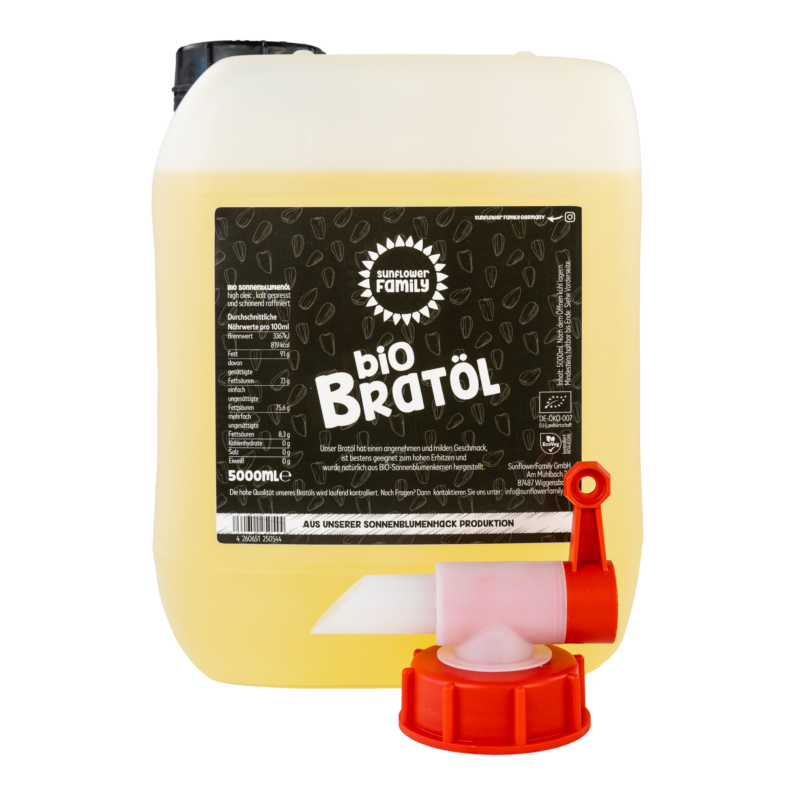sunflowerFamily Bio-Bratöl, 5000 ml, aus Sonnenblumenkernen, ist reich an Vitamin E, hat einen milden Geschmack und ist bestens geeignet zum hohen Erhitzen. Gewonnen aus der sunflowerHack Produktion. Im Kanister mit Auslaufhahn.