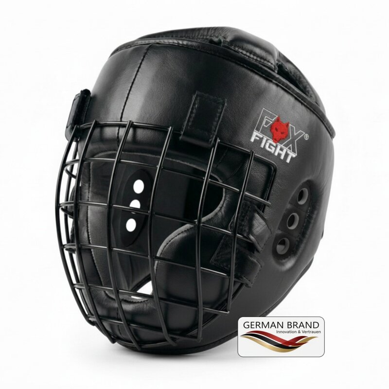 FOX-FIGHT Leder Kopfschutz mit Metallgitterfront Dieser Kopfschutz mit Metallgitterfront schützt die Nase und das Gesicht beim Training. Die Gitterfront ist abnehmbar. Der Kopfschutz ist aus echtem Rindsleder mit hochwertigem Amara-Einsatz an der Innenseite. Der Amara-Einsatz sorg für den angenehmen Tragekomfort und reduziert die Reibung. Eine Multi-Foam Polsterung gewährleistet die nötige Dämpfung und eine konstant bleibende Form. An der Kopfdecke ist ein gepolstertes Pad und am Hinterkopf ein Klettverschluss, welcher für die perfekte Fixierung sorgt und das schnelle An- und Ausziehen ermöglicht. Kurzbeschreibung Material: Rindsleder / Amara (Innenseite) Form: bequem mit Gitterfront (abnehmbar) Polsterung: Multi-Foam Polsterung (mehrlagige Polsterung) Verschluss: Klettverschluss am Hinterkopf Größentabelle S / M (54 – 56cm*) L / XL (57 – 60cm*) *Kopfumfang – gemessen an der Stirn