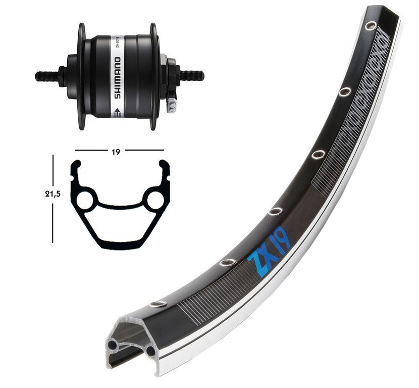 Beschreibung Felge:26 x 1.75 EXAL ZX 19 36 Loch, Alu, schwarz/poli. Flanken ETRTO 559-19 mit Ösen Ventilloch 8,5mmBeschreibung Nabe:VR Nabendynamo Shimano DH C 3000 schwarz GW 100mm Speichen Niro schwarz Vollachse ohne Schalter