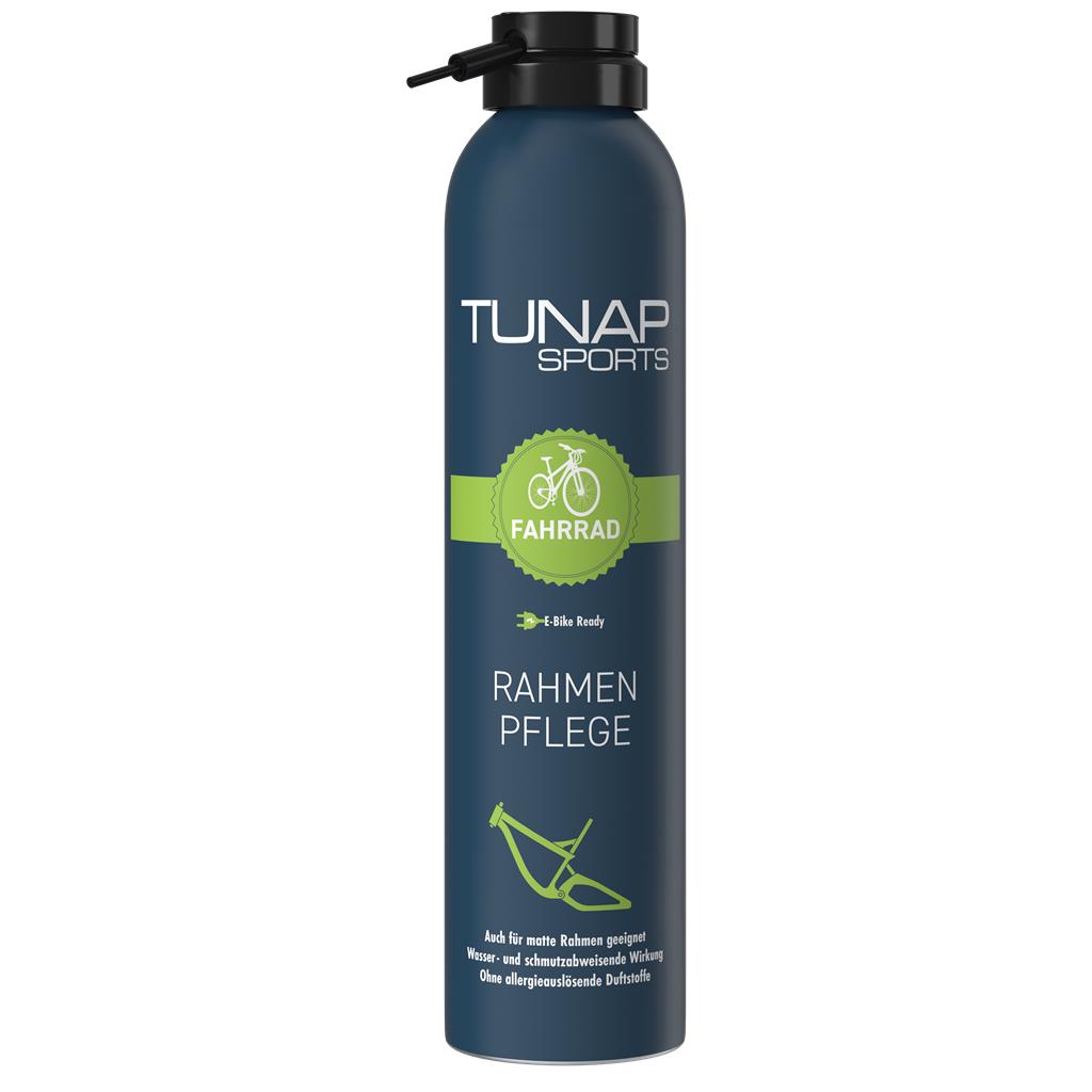 TS160 Rahmenpflege Die TUNAP SPORTS Rahmenpflege versiegelt die Oberfläche des Rahmens und schützt vor Korrosion und Schmutz. Die Pflege ist für alle Oberflächenstrukturen geeignet und besonders materialverträglich auch bei mattlackierten Rahmen. Durch die Spray-On Anwendung ist die Handhabung besonders einfach. TUNAP SPORTS Qualitätsversprechen: Oberflächenversiegelung zum Schutz des Rahmens vor Korrosion und Schmutz. Besonders gute Materialverträglichkeit mit allen gängigen Rahmenmaterialien. Sehr einfache Handhabung durch die Spray-On Anwendung. Eigenschaften Mikroverletzungen an der Rahmenoberfläche werden gefüllt und entsprechend versiegelt. Auch für mattlackierte Rahmen, sowie alle anderen Oberflächenstrukturen geeignet. Schmutz und Wasser perlen nach Anwendung sichtbar leichter ab. E-Bike Ready. Anwendungsgebiet Nach dem Waschen des Fahrrades für eine optimale Pflege des Rahmens. Anleitung 1. Das Fahrrad mit dem TUNAP Sports Fahrradreiniger säubern und trocknen.2. Die Rahmenpflege auf ein weiches Tuch aufsprühen und auf den Rahmen auftragen.3. Die Politur einreiben. Es ist kein nachpolieren mehr notwendig. Hinweis Die Rahmenpflege nicht auf die Bremsscheiben und Bremsklötze sprühen!