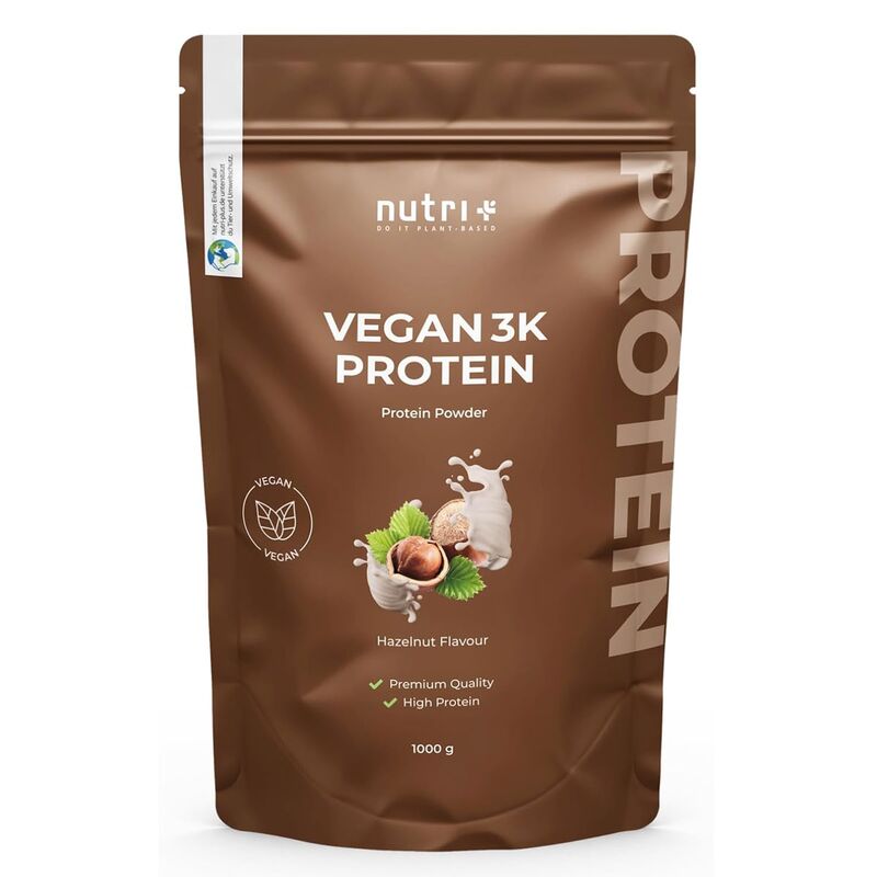 Was ist Nutri+ Vegan 3K Protein? Suchst du einen leckeren veganen Proteinshake, der dich voll und ganz geschmacklich und von der Konsistenz her ?berzeugt? Dann ist das Nutri+ Vegan 3K Protein genau das Richtige f?r dich. Es bietet nicht nur hervorragenden Geschmack, sondern auch eine samtig-cremige Textur, welche ein Genuss f?r deinen Gaumen ist. Das 3K Proteinpulver wird aus drei hochwertigen pflanzlichen Proteinquellen hergestellt: Sojaproteinisolat, Sonnenblumenprotein und Erbsenproteinisolat. Diese speziell ausgew?hlte Mischung gew?hrleistet eine optimale Versorgung mit Proteinen. Ein hoher Proteingehalt und ein vollst?ndiges Aminos?urenprofil werden dir optimal dabei helfen Muskeln langfristig aufzubauen &ndash und das ganz ohne tierische Proteine. Au?erdem deckt das 3K Protein dank einer breiten Palette an Geschmacksrichtungen jede Vorliebe ab. Ganz egal ob du einen fruchtig-cremigen Shake f?r hei?e Sommertage, eine schokoladige Verf?hrung oder etwas ganz Ausgefallenes suchst &ndash die verschiedenen Sorten bietet f?r jeden Geschmack das Richtige. Dar?ber hinaus ist das 3K Proteinpulver glutenfrei und somit ideal f?r alle, die eine glutenfreie Ern?hrung bevorzugen oder an Glutenunvertr?glichkeiten leiden. Die wichtigsten Fakten im ?berblick Hervorragender Geschmack und cremige Konsistenz: Genusserlebnis f?r den Gaumen Drei pflanzliche Proteinquellen: Sojaproteinisolat, Sonnenblumenprotein und Erbsenproteinisolat Hoher Proteingehalt und vollen Aminos?urenprofil Vielfalt an Geschmacksrichtungen &ndash f?r jeden das Richtige dabei! Glutenfrei: Ideal f?r glutenfreie Ern?hrung und bei Glutenunvertr?glichkeiten F?r wen ist Vegan 3K Protein empfehlenswert? Das Nutri+ Vegan 3K Protein ist ideal f?r alle, die Wert auf Geschmack und Qualit?t bei ihrem Proteinpulver legen. Es eignet sich besonders f?r Veganer und Vegetarier, die eine pflanzliche Proteinquelle suchen. Fitnessbegeisterte und Sportler profitieren von der hochwertigen Proteinzufuhr f?r Muskelaufbau und -regeneration. Menschen mit Glutenunvertr?glichkeiten oder diejenigen, die eine glutenfreie Ern?hrung bevorzugen, finden in diesem Proteinpulver die perfekte Wahl. Hinweis: Verpackung kann m?glicherweise aufgrund eines Designwechsel vom Bild abweichen.