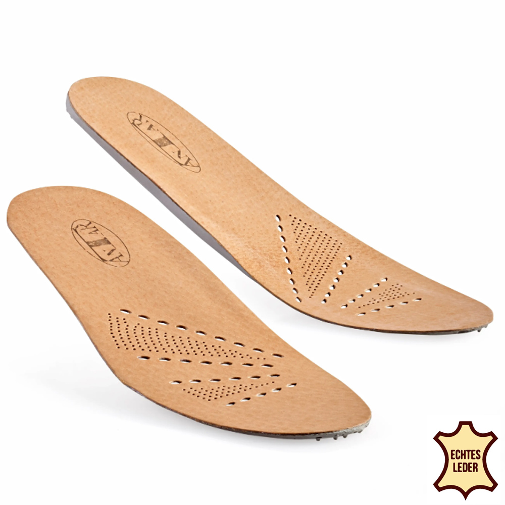 Mit Längs- und Quergewölbestütze  Ideal bei Plattfüßen  Lindern Beschwerden im Bereich der Fußsohle  Aus Leder auf geschäumtem Untergrund  Orthopädische Einlagen aus Leder mit Längs- und Quergewölbestütze sind das ideale Hilfsmittel bei Quer- und Längs-Plattfüßen sowie bei einer X-Stellung der Fersen und Knie. Mit dem auswärtsdrehenden Keil und der Metatarsal-Pelotte unterstützen die Einlagen sanft das Gewölbe Ihres Fußes. Sie federn Stöße ab und lindern Beschwerden im Bereich der Fußsohle. Im Fersenteil wird Ihr Fuß durch eine Vertiefung stabilisiert, während im vorderen Teil die Perforierung eine gute Luftzirkulation gewährleistet. Diese sorgt zudem für eine sanfte Massage der Zehenköpfe. Die Oberfläche der orthopädischen Einlagen aus Leder mit Längs- und Quergewölbestütze ist aus robustem Naturleder, der Untergrund aus geschäumtem und abfederndem Latex gefertigt.  Die orthopädischen Einlagen aus Leder mit Längs- und Quergewölbestütze bieten dauerhaft gesunden Laufkomfort.  Zertifikat „Gesunder Fuß“  Aus Leder und Latex    Abbildung ähnlich!!
