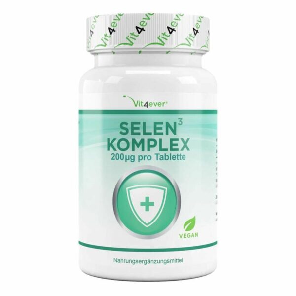 Was hat es mit dem Selen³ Komplex von Vit4Ever auf sich? Selen ist ein wichtiges Spurenelement in unserem Körper und Bestandteil vieler Enzyme. Selen hilft der Immunabwehr, ist an antioxidativen Aktivitäten beteiligt, sowie bei der Produktion von Schilddrüsenhormonen. Es spielt eine wichtige Rolle bei der Aufrechterhaltung eines gesunden Stoffwechsels. Es ist natürlicherweise zwar in Lebensmitteln vorhanden, doch das alleine garantiert nicht unbedingt eine ausreichende Versorgung mit Selen. Besonders dann, wenn man nur pflanzliche Produkte zu sich nimmt. Der Selen 3-fach Komplex in Tablettenform hilft hier mit drei unterschiedlichen, aufeinander abgestimmten Formen des Selens. Das garantiert eine optimale Bio-Verfügbarkeit und ist damit einfacheren, einseitiger ausgelegten Selensupplementen überlegen. Die wichtigsten Fakten im Überblick 3 Selenformen 2:1:1 Verhältnis Optimale Bioverfügbarkeit Ohne unerwünschte Zusätze Europäischen Qualitätsstandards* *Nach DIN EN ISO 9001 und HACCP-Konzept hergestellt Für wen ist der Selen³ Komplex von Vit4Ever empfehlenswert? Der Selen³ Komplex von Vit4Ever ist für alle Menschen geeignet, die eine gesunde Lebensweise pflegen und den gesunden Stoffwechsel des Körpers unterstützen oder mögliche Versorgungsdefizite vermeiden möchten. Diese Tabletten sind dafür ein hochwertiges Produkt zu einem günstigen Preis.